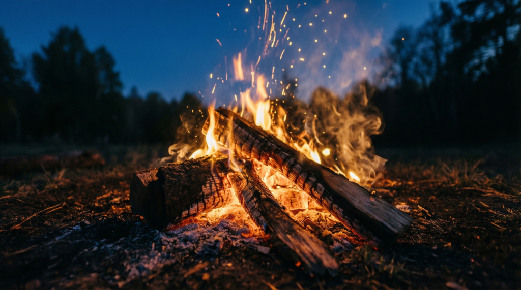 - The fire crackles, but the vibe is calm.